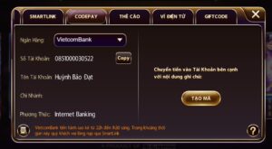 - Bước 3: Lúc này game bài Macau Club sẽ đưa ra cho bạn một bảng danh sách những cách nạp tiền phổ biến nhất. Khi đó bạn hãy chọn hình thức nạp tiền thông qua Codepay và chọn ngân hàng bạn sử dụng để gửi tiền. Sau đó bấm tạo mã.