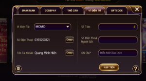 - Bước 3: Lúc này game bài Macau Club sẽ đưa ra cho bạn một bảng danh sách những cách nạp tiền phổ biến nhất. Khi đó bạn hãy chọn hình thức nạp tiền thông qua ví điện tử Momo