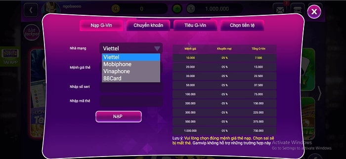 • Bước 2: Tại mục nạp G-Vin, bạn chọn phương thức nạp tiền qua thẻ cào.