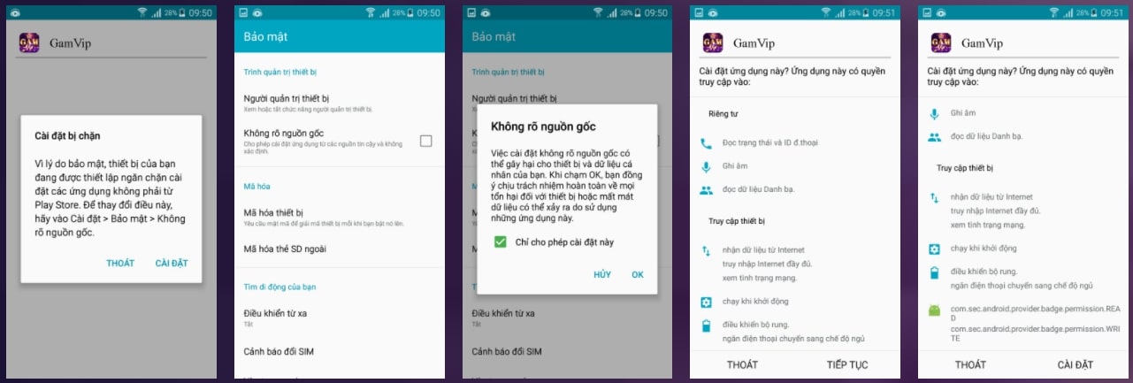 • Bước 1: Vào Cài đặt, chọn Quản lý ứng dụng, tích vào Không rõ nguồn gố Bạn phải bật chức năng này lên để cho phép cài đặt ứng dụng.