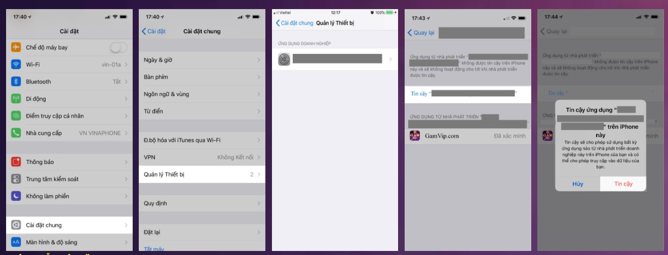 • Bước 4: Cài đặt → Cài đặt chung → Quản lý thiết bị → [Tên đơn vị Phát hành] → Tin cậy