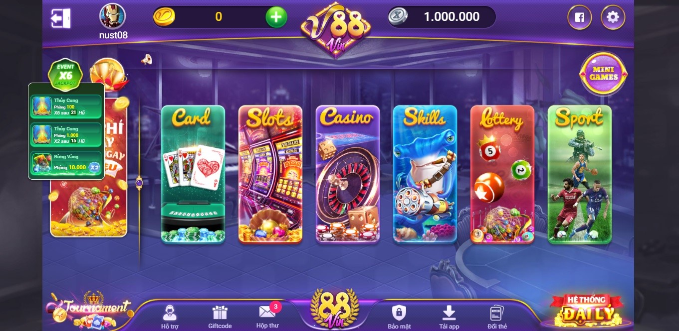 Slot là một trò chơi cực kì hấp dẫn và được nhiều cổng game đưa vào để kinh doanh. Và tất nhiên Vin88 cũng không phải là một trường hợp ngoại lệ. Đặc biệt các slot game tại Vin88 đều được tích hợp tính năng nổ hũ. Tính năng này đã giúp cho rất nhiều người chơi tại Vin88 giành được cả trăm triệu đồng khi có thể nổ hũ. Một số trò chơi nổ hũ hấp dẫn tại Vin88 có thể kể đến như Vương Quốc, Sấm Truyền, Thần Tài, Thủy Cung, Rừng Vàng, Gái Nhảy, Số Đỏ.
